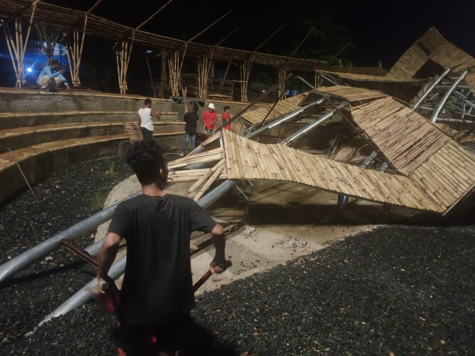 Terlihat para pekerja yang berada di lokasi berusaha untuk melepaskan bambu-bambu yang digunakan sebagai bahan kontruksi.