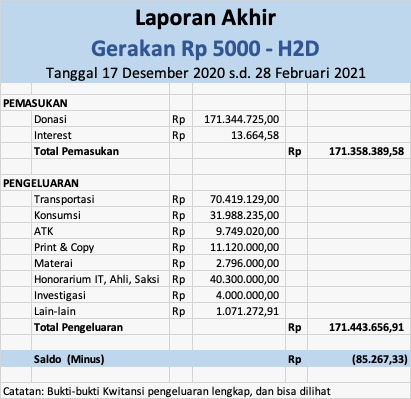 Dalam rilis yang disampaikan ke Kanalkalimantan.com, selama donasi yang dilakukan pada 17 Januari sampai 28 Februari, terkumpul dana sebesar Rp 171.344.725,00. Dana tersebut digunakan untuk sejumlah keperluan selama sidang, mulai dari transportasi, honorarium IT, ahli, saksi, hingga investigasi.