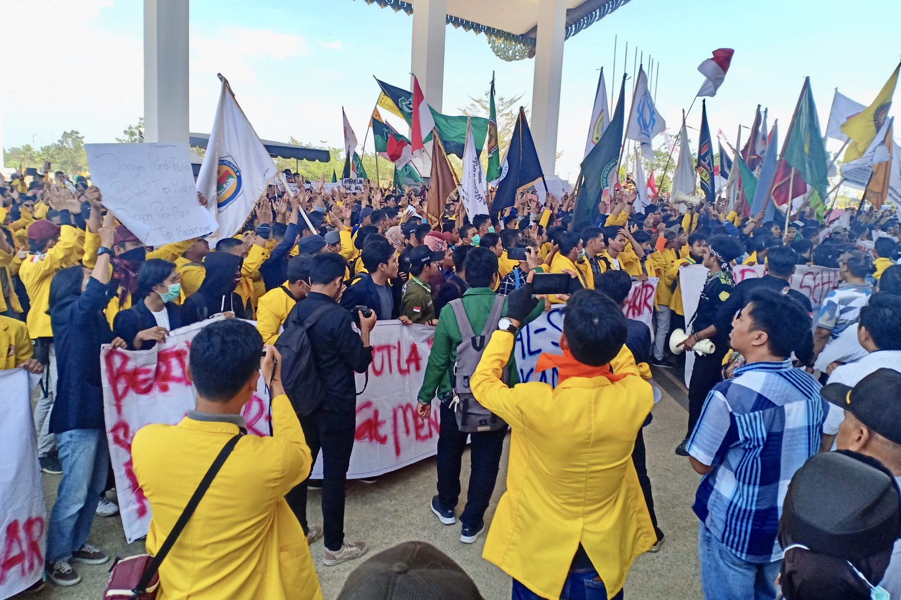 BANJARBARU, Ratusan mahasiswa-mahasiswi dari berbagai kampus yang ada di Kalsel mendatangi Kantor Sekretariat Daerah Provinsi Kalimantwn Selatan, Selasa (24/9). Massa ini berunjuk rasa untuk menanggapi bencana kabut asap akibat kebakaran hutan dan lahan (karhutla) yang terjadi di Kalsel.