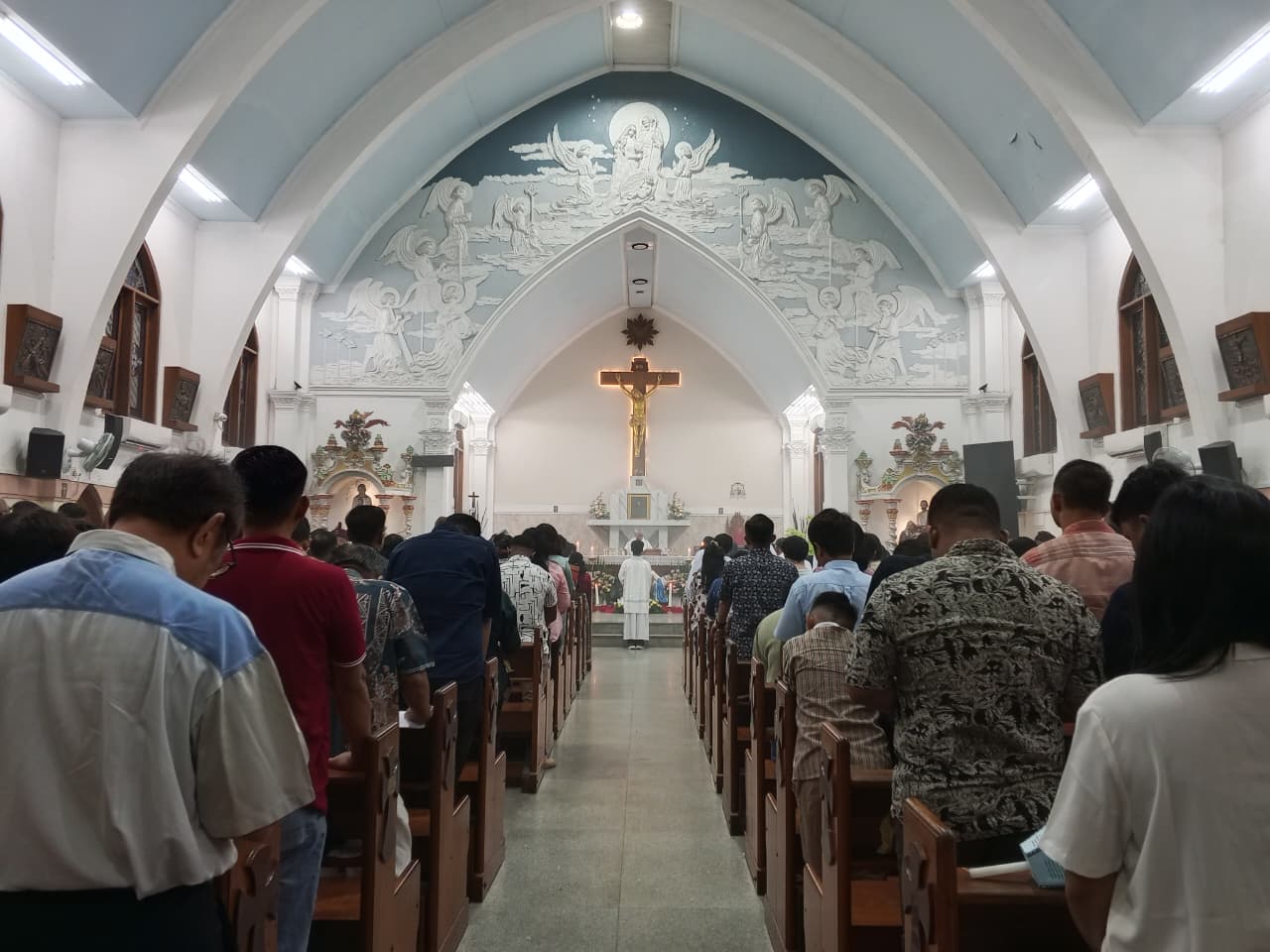 Suara lonceng dan kepulan asap dupa membuat suasana perayaan puncak rangkaian ibadah Natal semakin khidmat. Jemaat bukan hanya berasal dari Paroki Katedral Banjarmasin saja, melainkan umat di luar daerah turut membersamai.