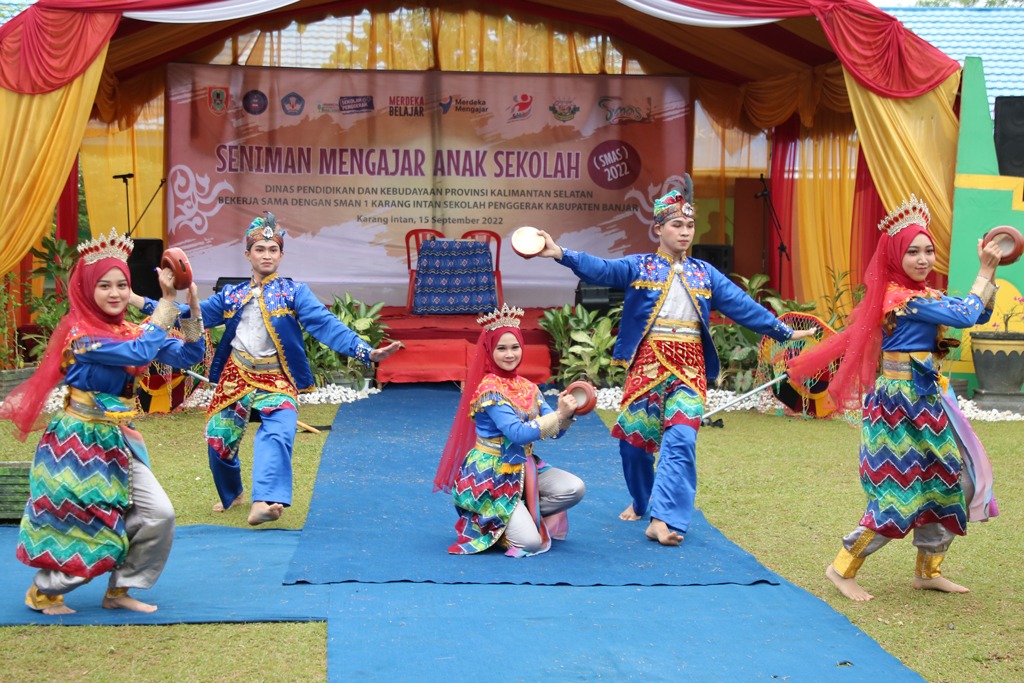KANALKALIMANTAN.COM, MARTAPURA – Berbagai tampilan seni diperlihatkan oleh siswa-siswi SMAN 1 Karang Intan bersama Sanggar Kamilau Intan, seperti seni rupa, seni tari, musik dan seni teater dalam pentas akhir “Seniman Mengajar Anak Sekolah” (SMAS) yang dihelat Dinas Pendidikan dan Kebudayaan (Disdikbud) Provinsi Kalimantan Selatan, Kamis (15/9/2022) pagi.