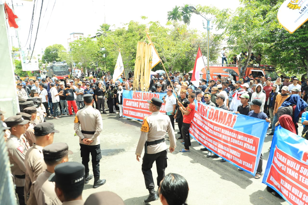 Di bawah pengamanan ketat anggota Polres HSU kegiatan unjuk rasa damai kali ini berlangsung aman, tertib, dan kondusif, tanpa menimbulkan gangguan keamanan maupun ketertiban umum.