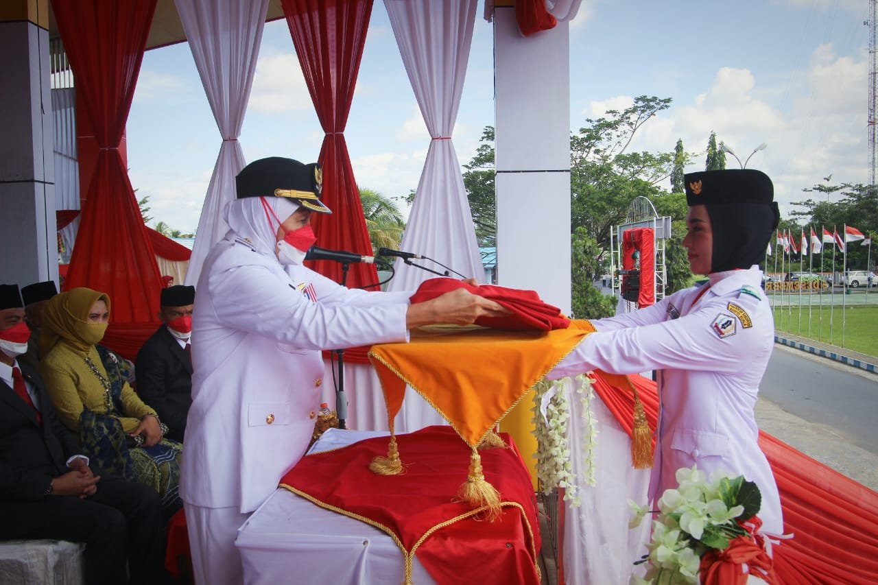 Pengibaran bendera merah putih diawali penyerahan oleh Bupati Barito Kuala Hj Noormiliyani AS kepada anggota paskibra Jehan Novia Hafizsya (pelajar SMAN 1 Marabahan).