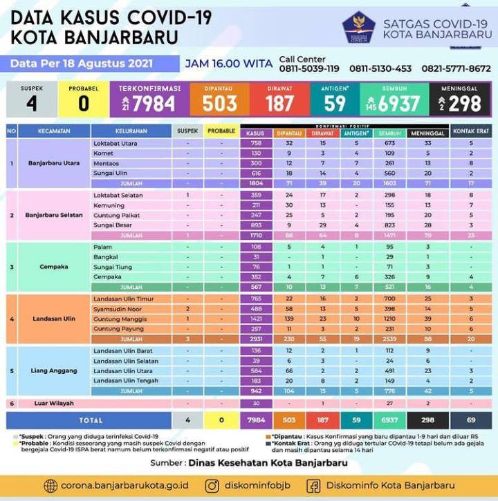Data Dinas Kesehatan (Dinkes) Kota Banjar Baru yang dirilis Diskominfo Kota Banjarbaru pada Rabu (18/8/2021), penambahan disumbang oleh Kelurahan Loktabat Utara (7), Komet (3), Mentaos (1), Sungai Ulin (1), Sungai Besar (1), Palam (1), Cempaka (1), Landasan Ulin Timur (1), Syamsudin Noor (1) dan Guntung Manggis (1).