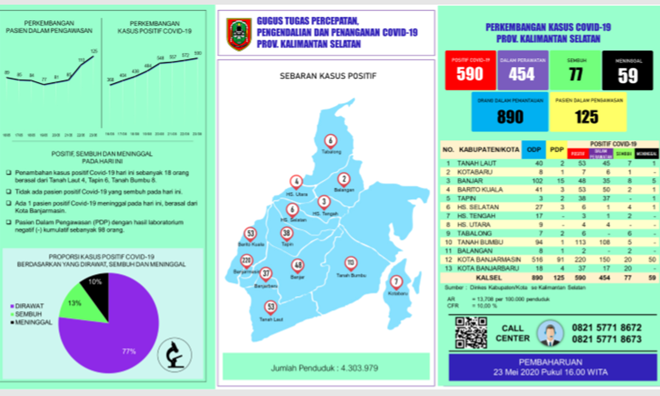 Sehingga Kalsel kini mencatat sebanyak 590 kasus positif Covid-19. Dari jumlah tersebut 454 kasus di antaranya menjalani perawatan di rumah sakit dan menjalani karantina khusus.