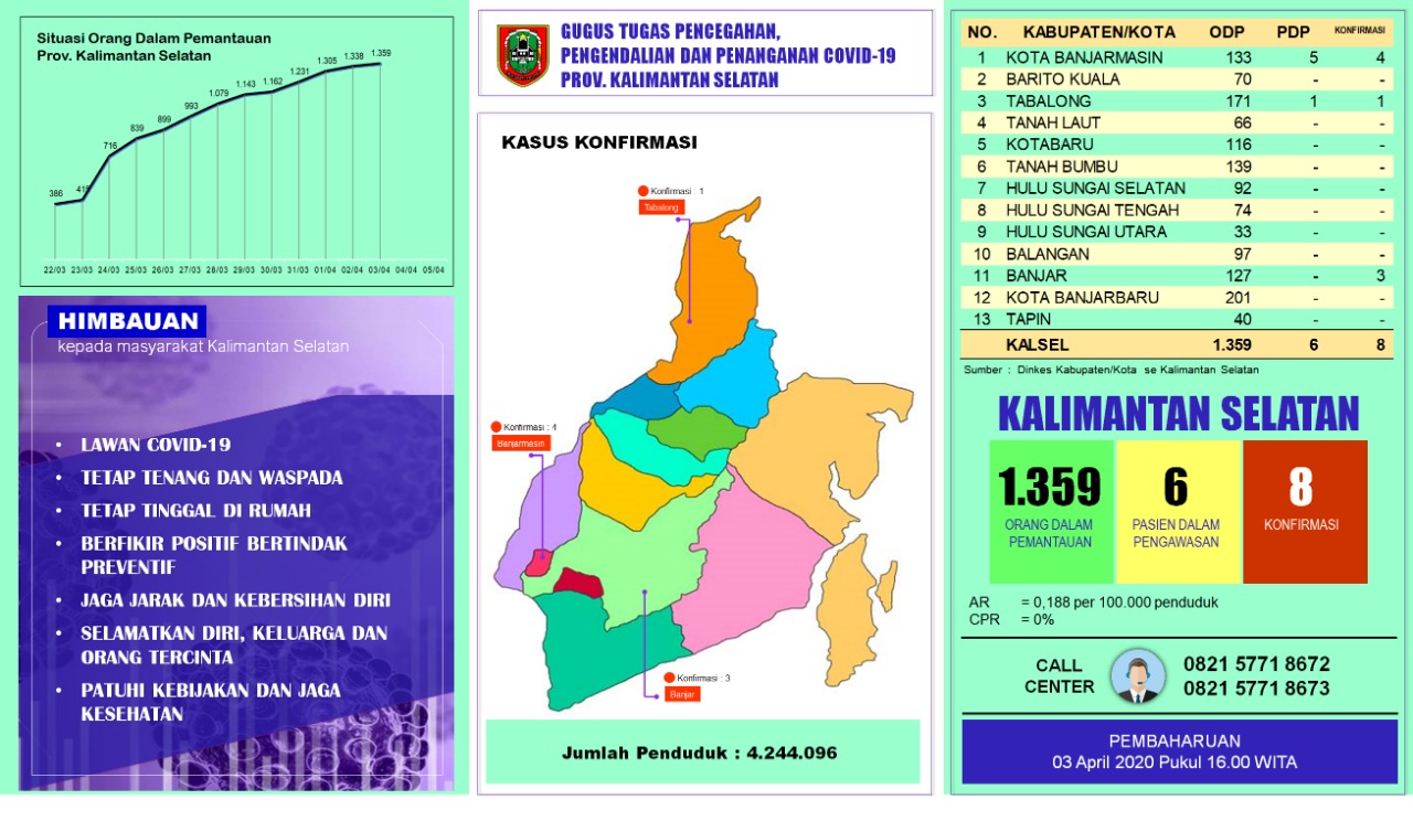 KANALKALIMANTAN.COM, BANJARBARU – Tim Gugus Tugas P3 Covid-19 Kalimantan Selatan kembali merilis data terbaru jumlah Orang Dalam Pemantauan (ODP), Pasien Dalam Pengawasan (PDP), dan pasien positif Covid-19. Data per Jum’at (3/4/2020) pukul 17.00 Wita, ada terjadi penambahan dari jumlah ODP maupun PDP.