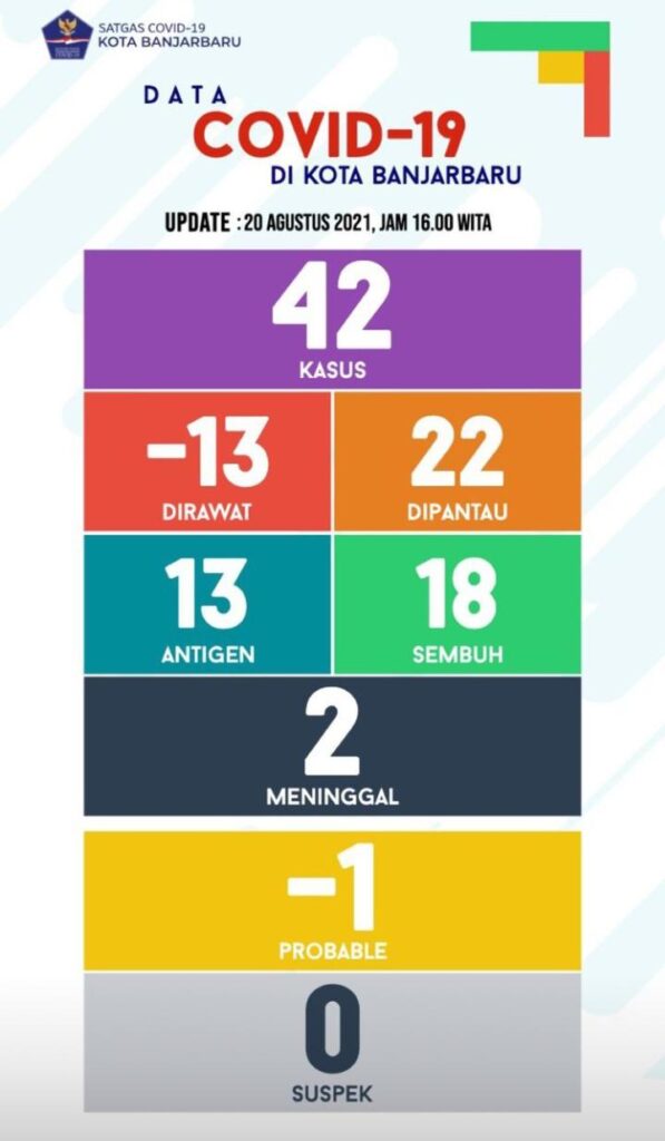 KANALKALIMANTAN.COM, BANJARBARU – Kasus Covid-19 di Kota Banjarbaru hari ini ada penambahan 42 kasus. Data Dinas Kesehatan (Dinkes) Kota Banjarbaru yang dirilis Diskominfo Kota Banjarbaru pada pukul 16.00 Wita Jumat (20/8/2021), jumlah ini meningkat pada hari sebelumnya Kamis (19/8/2021) sebanyak 31 orang.