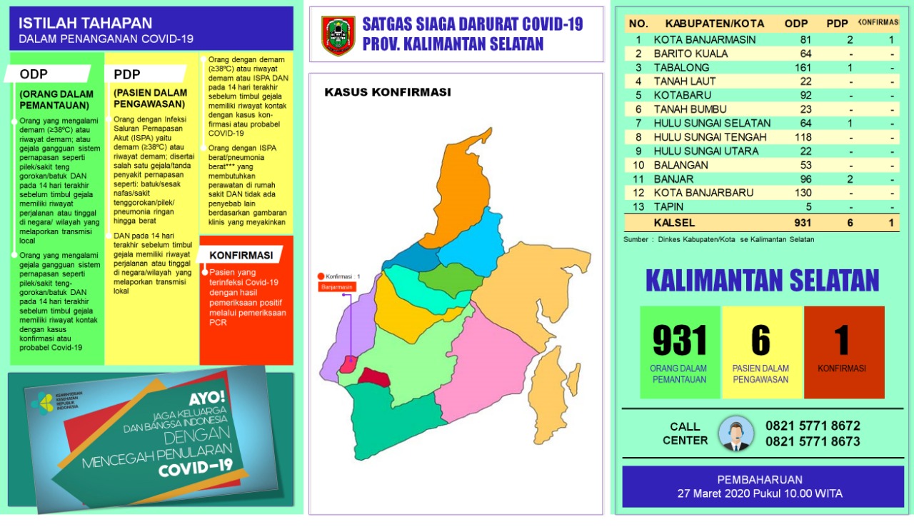 KANALKALIMANTAN.COM, BANJARMASIN – Jumlah orang dalam pemantauan (ODP) di Kalimantan Selatan semakin bertambah. Data terbaru pada Jumat (27/3/2020) pagi, jumlah ODP meroket menjadi 931 orang.