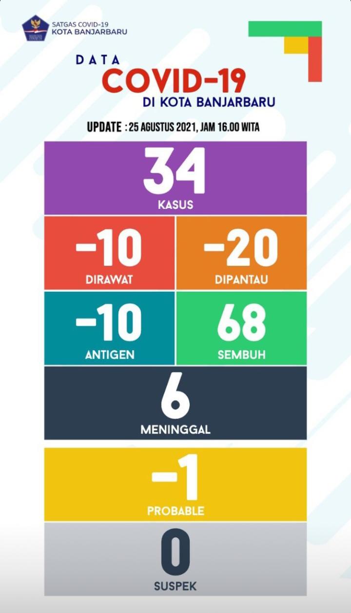 Penambahan kasus positif terkonfirmasi sebanyak 34 kasus, berasal dari Kelurahan Loktabat Utara 4 orang, Komet 4 orang, Landasan Ulin Timur 4 orang, Syamsudin Noor 4 orang, Landasan Ulin Tengah 4 orang, Guntung Manggis 3 orang, Guntung Payung 2 orang, Mentaos 2 orang, Guntung Paikat 2 orang, Loktabat Selatan 1 orang, Kemuning 1 orang, Sungai Besar 1 orang, Bangkal 1 orang, Cempaka 1 orang, Landasan Ulin Barat 1 orang dan Landasan Ulin Selatan 1 orang.