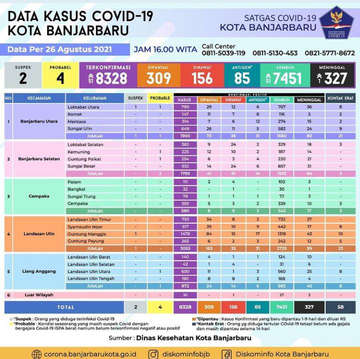 Sedangkan pasien sembuh ada 51 orang dari yang terbanyak kelurahan Sungai Besar 11 orang dan Landasan Ulin Utara 8 orang, disusul kelurahan Kemuning 7 orang, Loktabat Selatan 4 orang, Guntung Paikat 4 orang, Syamsudin Noor 3 orang, Landasan Ulin Tengah 2 orang, Guntung Manggis 2 orang, Sungai Ulin 2 orang, Mentaos 2 orang, Komet 2 orang, Loktabat Utara 1 orang, Cempaka 1 orang, Landasan Ulin Timur 1 orang, Landasan Ulin Barat 1 orang.