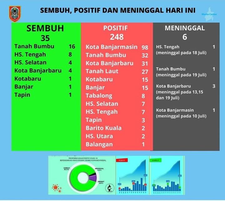 Dikabarkan pasien yang meninggal berjumlah 6 orang berasal dari Hulu Sungai Tengah sejumlah 1 orang (meninggal pada tanggal 18 Juli), Tanah Bumbu 1 orang (meninggal pada 19 Juli), Kota Banjarbaru 3 orang (meninggal pada 13,15, dan 19 Juli), dan Banjarmasin 1 orang (meninggal pada tanggal 10 Juli).
