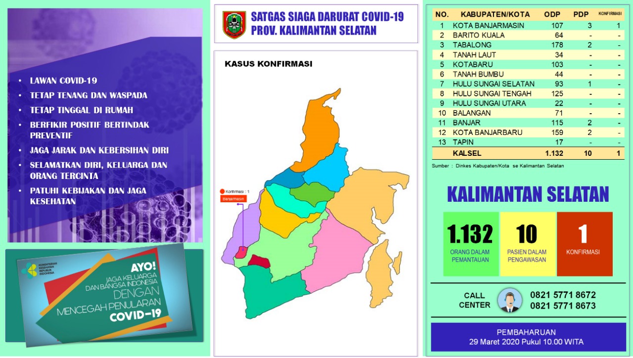 Sementara itu, jumlah pasien dalam pengawasan (PDP) bertengger di angka 10 orang, namun ada sedikit perubahan. Di mana, jumlah PDP dari Kota Banjarmasin berkurang menjadi 3 orang. Kemudian, ada penambahan jumlah PDP dari Kabupaten Tabalong menjadi 2 orang, serta Kabupaten Banjar dan Kota Banjarbaru masing-masing bertengger di angka 2 orang PDP.