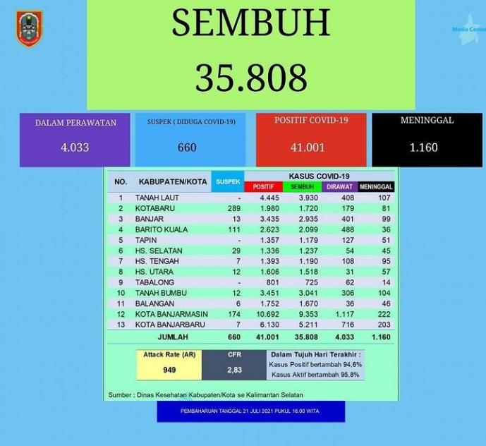Secara kumulatif dinyatakan total sembuh 35.808, dalam perawatan 4.033, diduga covid-19 660, positif 41.001, dan meninggal 1.160. Angka serangan naik menjadi 949 dan angka kematian tetap 2,83. Secara kumulatif dalam 7 hari terakhir kasus positif bertambah 94,6 persen dan kasus aktif bertambah 95,8 persen.(Kanalkalimantan.com/nurul)