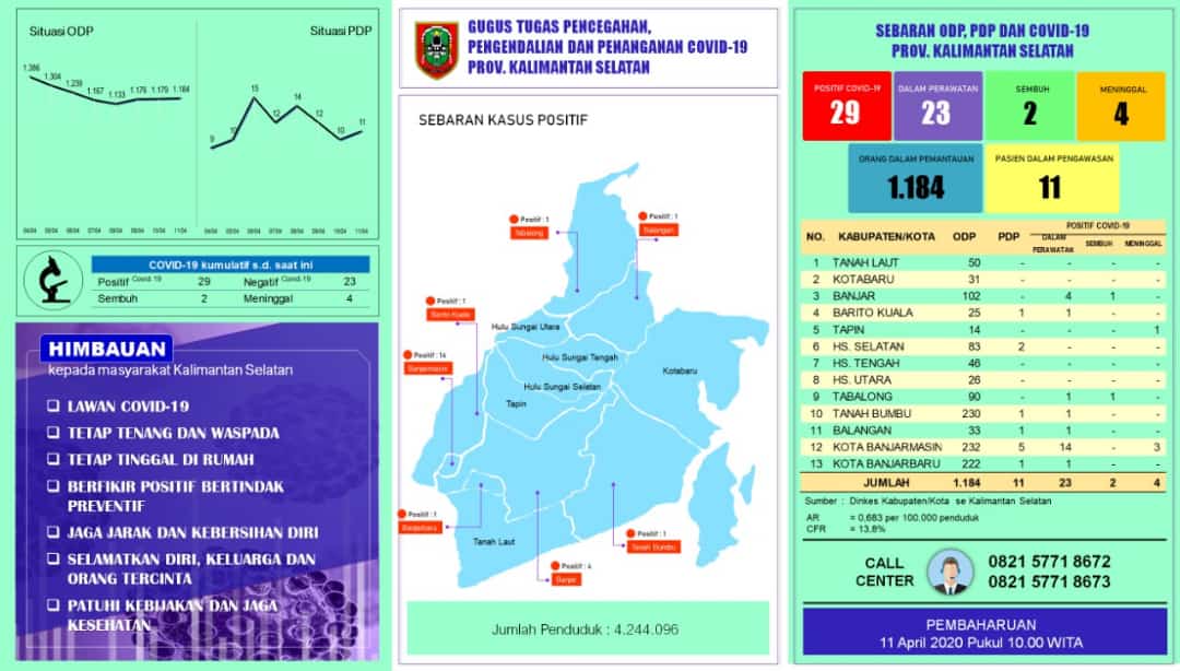 KANALKALIMANTAN.COM, BANJARMASIN – Jumlah orang dalam pemantauan (ODP) di Kalimantan Selatan kembali bertambah, walau tidak begitu signifikan. Jika pada Jumat (10/4/2020) sore berjumlah 1.179 orang, maka pada Sabtu (11/4/2020) pagi bertambah 5 orang menjadi 1.184 orang.