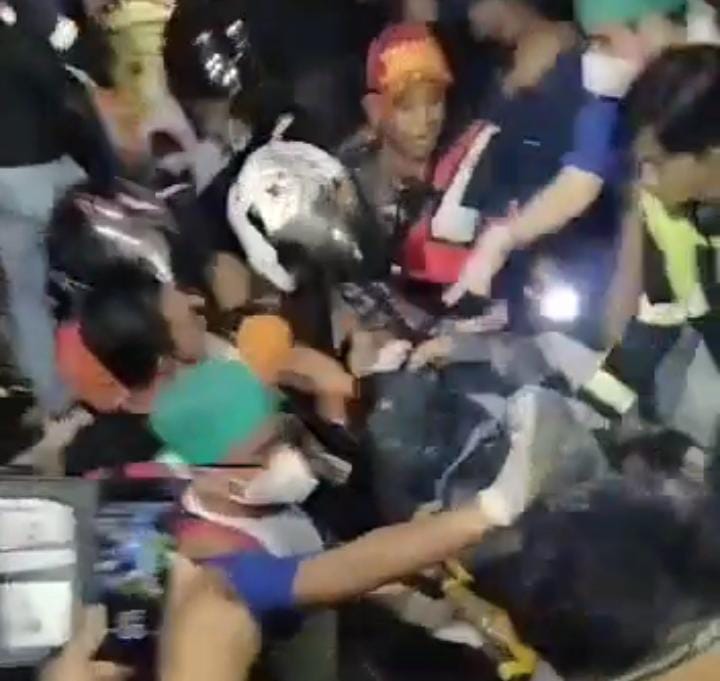 Dalam tayangan video amatir, terlihat relawan bersama polisi menemukan dua korban yang selamat dari puing rereuntuhan Alfamart.