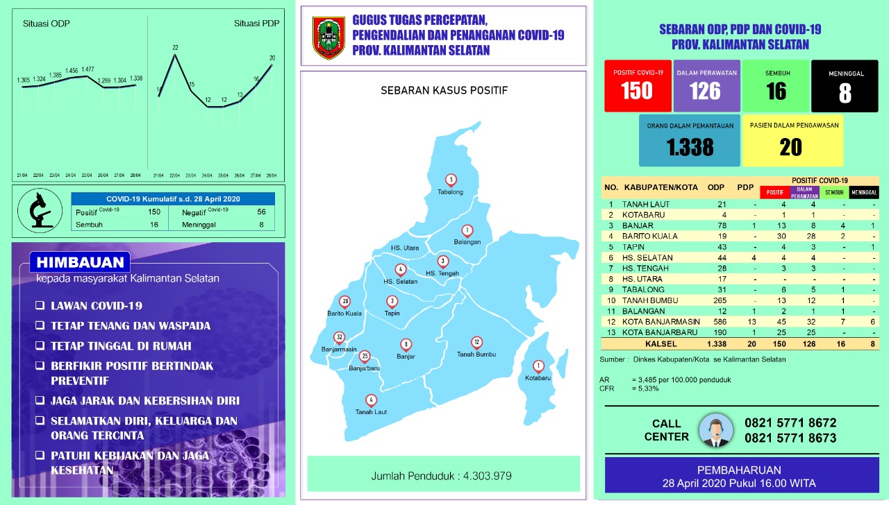 Data dari Tim Gugus Tugas Percepatan Penanganan Covid-19 Kalimantan Selatan mencatat, jumlah kasus terkonfirmasi positif Covid-19 masih berjumlah 150 kasus.