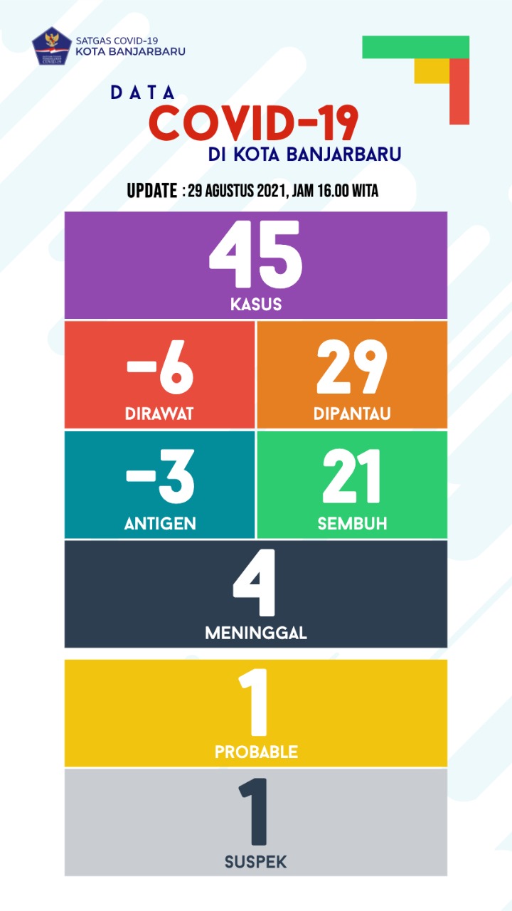 KANALKALIMANTAN.COM, BANJARBARU – Kasus positif Covid-19 di Kota Banjarbaru pada Minggu (29/8/2021) ada penambahan 45 kasus baru, 21 sembuh, dan 4 pasien meninggal dunia. Dengan demikian, total terkonfirmasi positif Covid-19 di Kota Banjarbaru sudah mencapai 8.441 kasus.