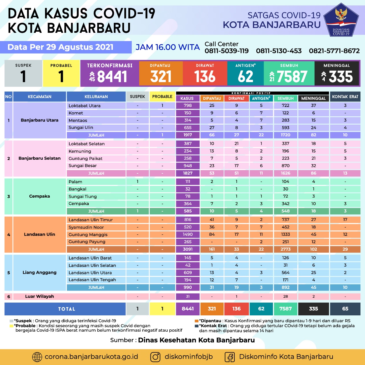 Penambahan juga disumbang Kecamatan Cempaka 3 orang, Guntung Manggis 7 orang, Landasan Ulin Barat 2 orang, Landasan Ulin Selatan 1 orang, Landasan Ulin Utara 1 orang dan paling banyak penyumbang terkonfirmasi covid-19 dari kelurahan Landasan Ulin Timur 20 orang.