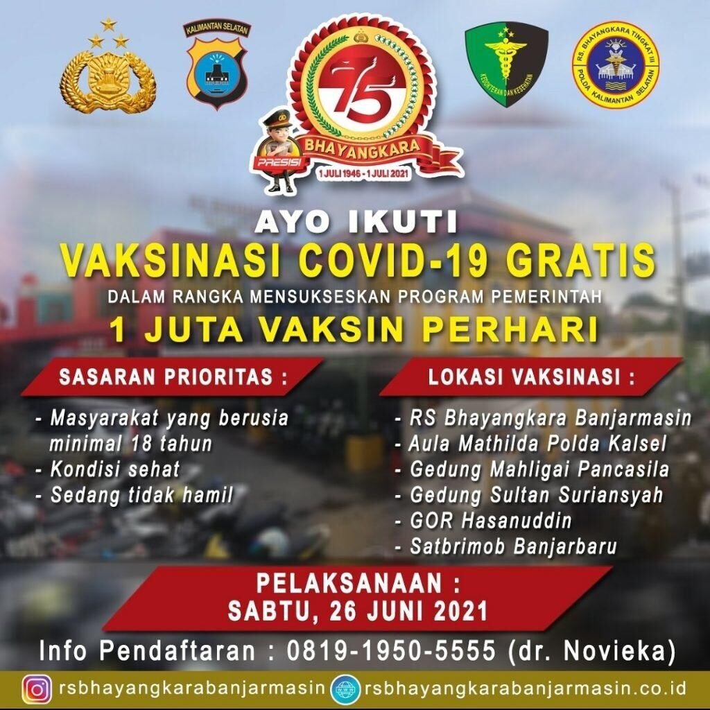 Kabid Humas Polda Kalsel Kombes Mochamad Rifa’i menyebutkan, vaksinasi serentak dilakukan dalam rangka menyambut HUT ke-75 Bhayangkara. Vaksinasi Covid-19 massal secara serentak dilakukan oleh 34 Polda serta jajaran dengan tema Satu Juta Vaksinasi.