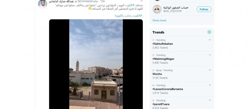 Media sosial, terutama twitter, dihebohkan dengan beredarnya rekaman azan shalat Jumat di sejumlah masjid Kuwait, pada Jum’at (13/3/2020).