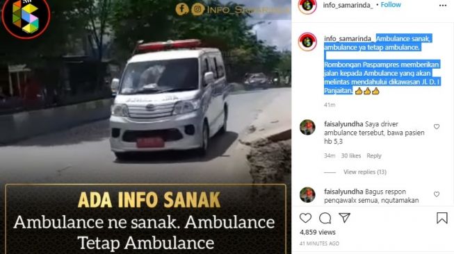 “Ambulance sanak (teman), ambulance ya tetap ambulance. Rombongan Paspampres memberikan jalan kepada Ambulance yang akan melintas mendahului dikawasan Jl. D. I Panjaitan,” tulis pemilik akun.