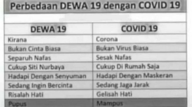 Tabel ini beredar di media sosial dan whatsapp group, sebuah tabel yang menyandingkan Dewa 19 dengan Covid 19 yang sempat viral tahun 2020 tersebut.