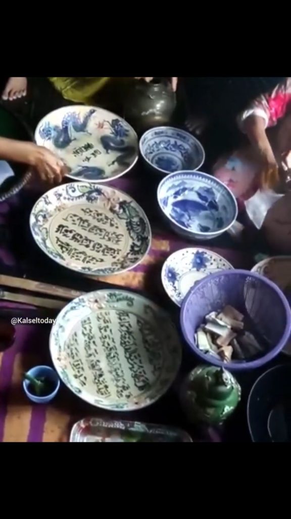 Sejumlah barang antik tersebut merupakan piring keramik dan mangkuk beraksara Arab dan Cina. Mirisnya, barang tersebut diambil dengan dalih untuk diminum dan diusapkan ke badan air yang ditaruh di atas satu piring besar bertulisan huruf arab tersebut.