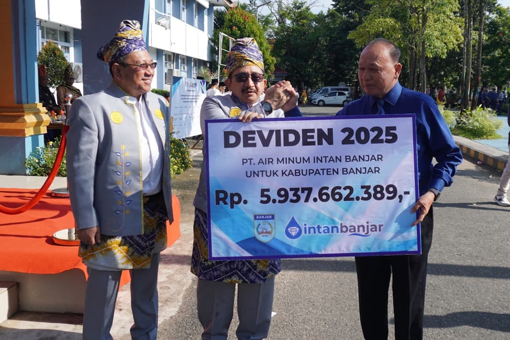 Pada kesempatan ini juga dilakukan penyerahan dividen laba bersih perusahaan tahun 2024 senilai Rp 5.937.662.389 dari Direktur Utama PTAM Intan Banjar kepada Wakil Bupati Banjar.