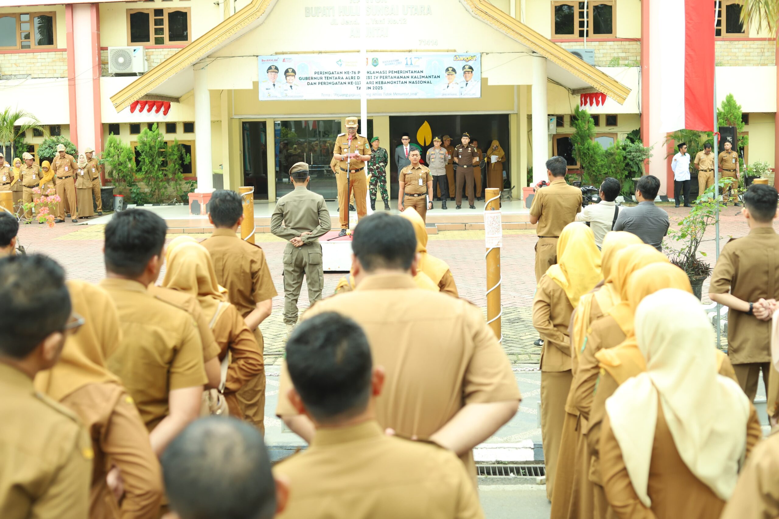 KANALKALIMANTAN.COM, AMUNTAI – Bertindak sebagai inspektur upacara, Wakil Bupati Hulu Sungai Utara (HSU) Hero Setiawan memimpin peringatan Hari Ulang Tahun (HUT) ke-76 Proklamasi Pemerintahan Gubernur Tentara ALRI Divisi IV Pertahanan Kalimantan sekaligus peringatan Hari Kebangkitan Nasional Ke-117 tahun 2025, di halaman kantor Bupati HSU, Selasa (20/5/2025) pagi.