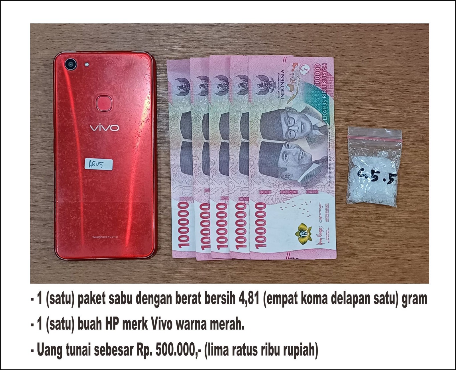 Selain satu paket sabu seberat 4,81 gram, polisi juga turut mengamankan dari tangan pelaku 1 buah HP merk Vivo, dan uang tunai Rp500 ribu sebagai barang bukti.