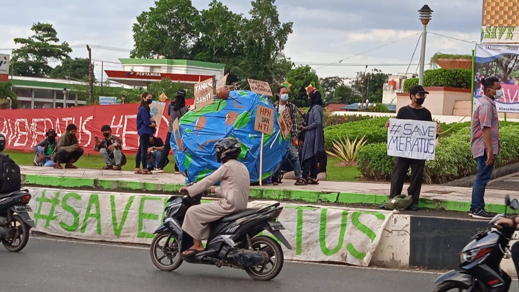 KANALKALIMANTAN.COM, BANJARBARU– Hari bumi diperingati aktivis pecinta lingkungan dengan menggelar demo di bundaran Banjarbaru, Kamis (22/4/2021). Pada kesempatan tersebut, mereka mempertanyakan komitmen pelestarian lingkungan di Kalsel.