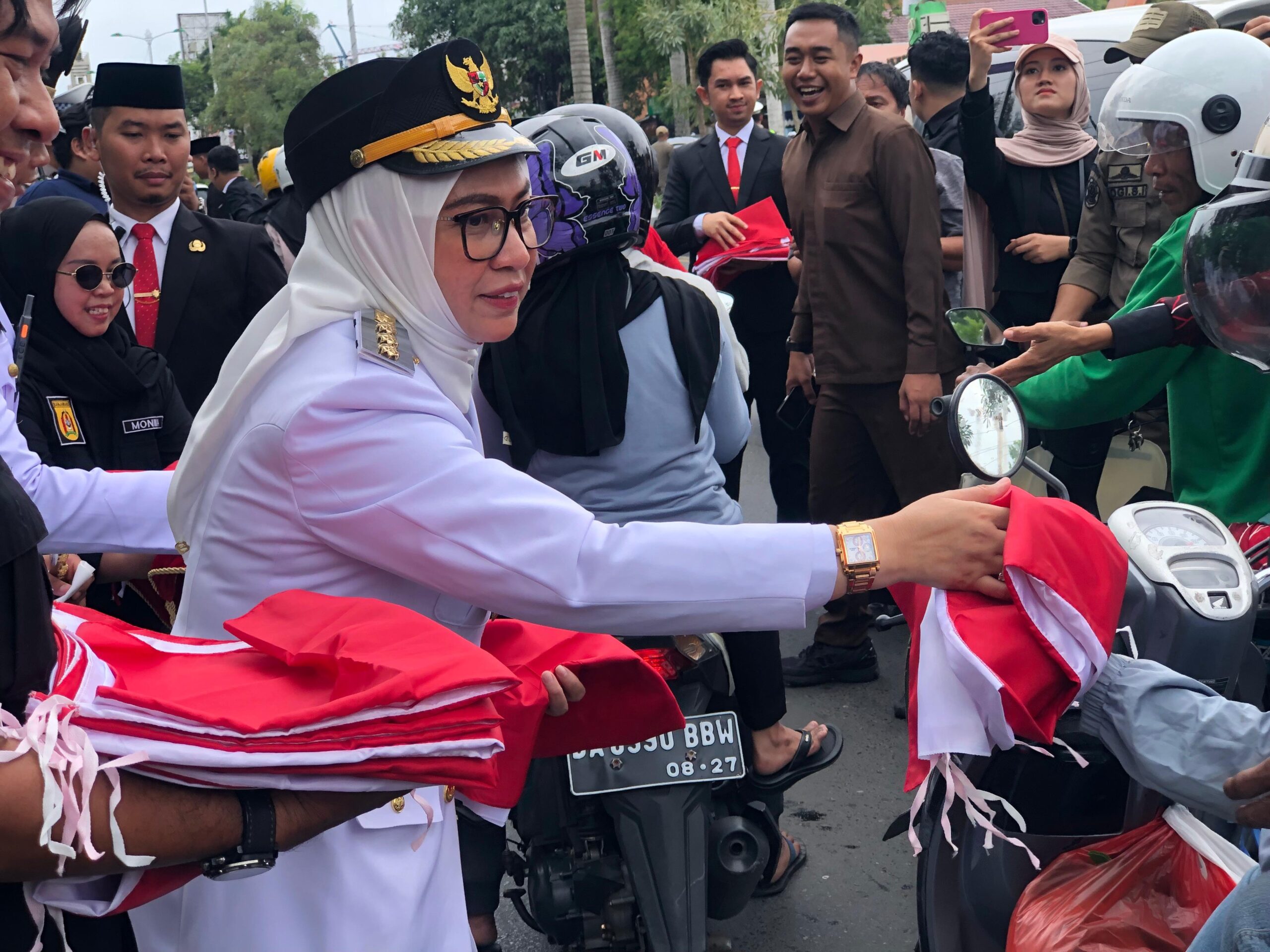 Ribuan bendera kecil dibagikan kepada pengendara yang melintas maupun warga yang berkumpul di kawasan tersebut.