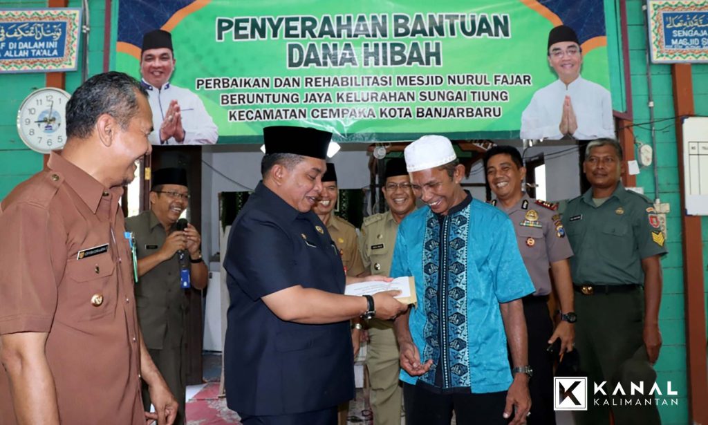 BANJARBARU, Walikota Banjarbaru H Nadjmi Adhani serahkan bantuan hibah Rp 50 juta untuk perbaikan Masjid Nurul Fajar Beruntung Jaya, Kelurahan Sungai Tiung Kecamatan Cempaka, Selasa (9/1).