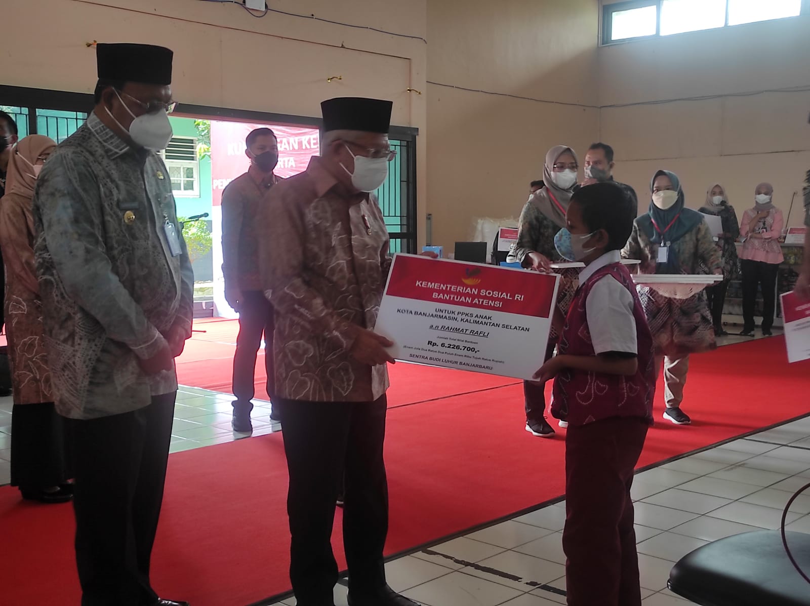 Dengan didampingi Gubernur Kalsel, H Sahbirin Noor, Wapres menyerahkan bantuan Atensi kepada penyandang disabilitas, lansia, rentan, napza/HIV dan anak di Kota Banjarmasin dan Banjarbaru.