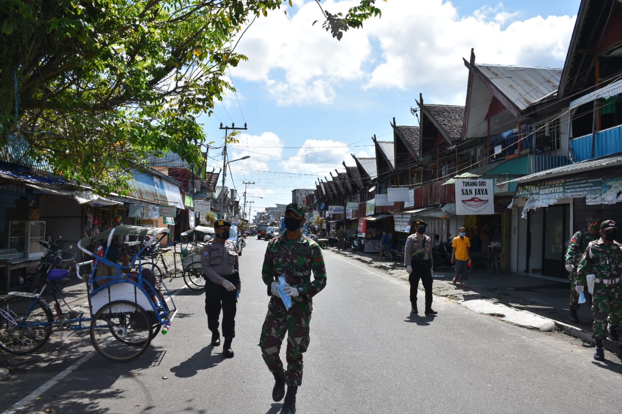 Tim gugus tugas berkeliling melakukan penertiban penggunaan masker bagi pedagang, pejalan kaki, pengendara motor dan mobil. foto: ags