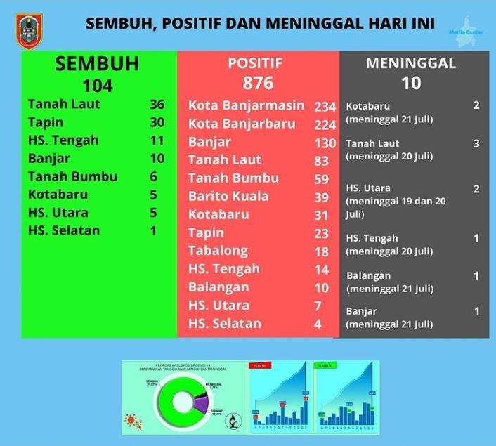 Dikabarkan pasien yang meninggal berjumlah 10 orang berasal dari Kotabaru sejumlah 2 orang (meninggal pada tanggal 21 Juli), Tanah Laut 3 orang (meninggal pada 20 Juli), Hulu Sungai Utara 2 orang (meninggal pada 19 dan 20 Juli), Hulu Sungai Tengah 1 orang (meninggal pada 20 Juli), Balangan 1 orang (meninggal pada tanggal 21 Juli), dan Kab Banjar 1 orang (meninggal pada 21 Juli).