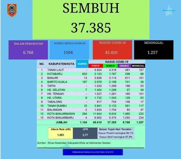 Secara kumulatif dinyatakan total sembuh 37.385, dalam perawatan 6.768, diduga covid-19 1.104, positif 45.410, dan meninggal 1.257. Angka serangan naik menjadi 1.051 dan angka kematian tetap 2,77. Secara kumulatif dalam 7 hari terakhir kasus positif bertambah 60,1 persen dan kasus aktif bertambah 67,8 persen.(Kanalkalimantan.com/nurul)