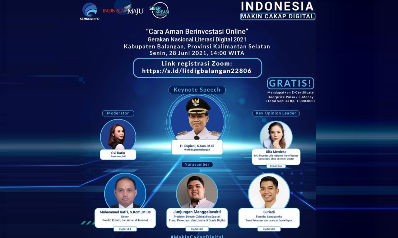 Hal ini mengemuka dalam webinar Kementerian Komunikasi dan Informatika bekerja sama dengan Siberkreasi l bertema ‘Cara Aman Berinvestasi Online’ sesi 2, di Kabupaten Balangan, Senin (28/6/2021) pukul 14.00 WITA. Acara dibuka Wakil Bupati Balangan H Supian, ini menampilkan sejumlah pembicara kompetan.