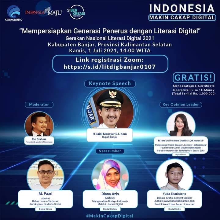 Dalam webinar literasi digital Kabupaten Banjar yang dilaksanakan Kamis (1/7/2021) dengan mengusung tema “Mempersiapkan Generasi Penerus Dengan Literasi Digital”, beberapa narasumber mengupas tema tersebut dengan gamblang.