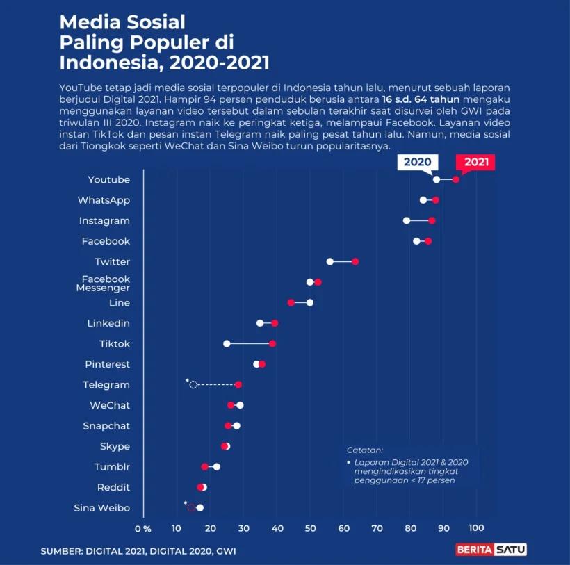 “Dilihat dari frekuensi penggunaan bulanan, urutan pertama aplikasi media sosial yang paling banyak digunakan di Indonesia ternyata ditempati oleh YouTube, disusul oleh WhatsApp, Instagram, Facebook, lalu Twitter secara berturut-turut,” ujar Ni Putu.