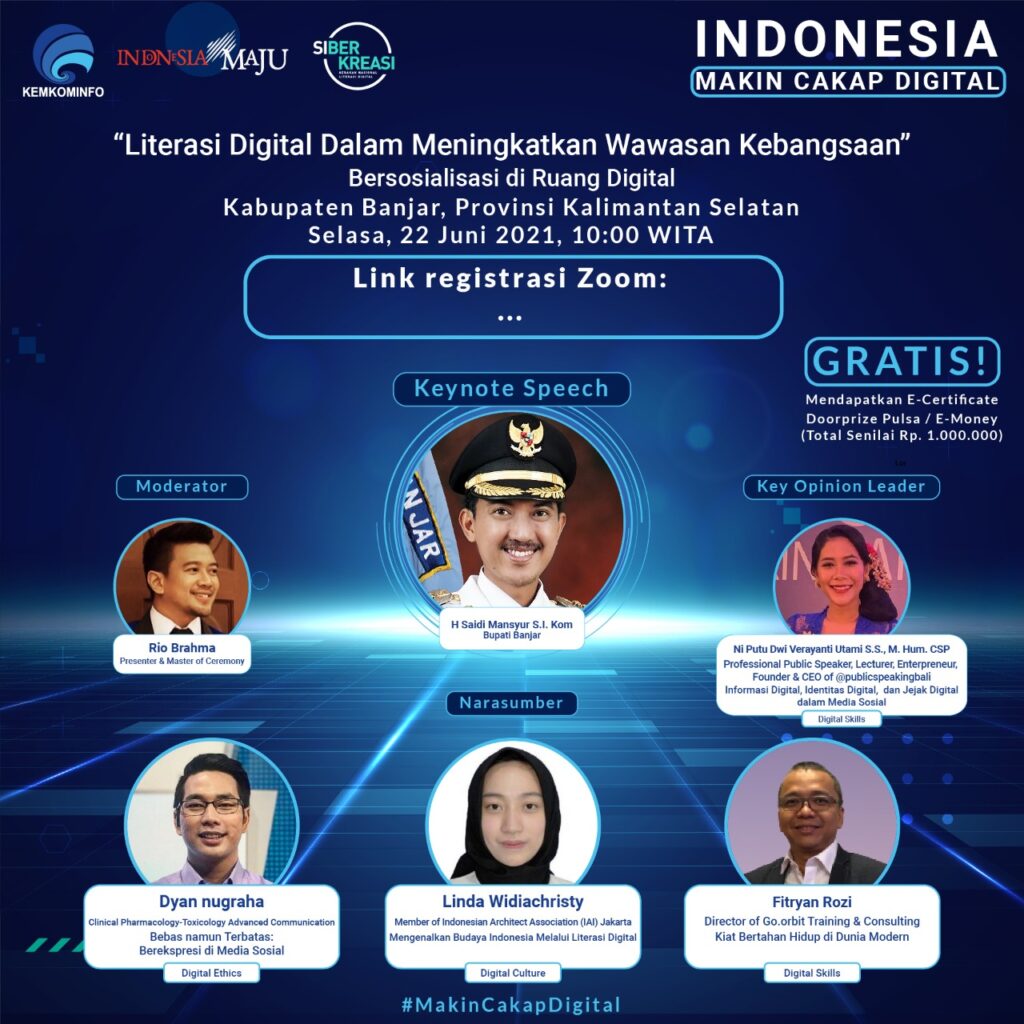 KANALKALIMANTAN.COM, MARTAPURA – Berlangsung secara virtual, webinar literasi digital dengan topik “Bersosialisasi di Ruang Digital” diselenggarakan di Kabupaten Banjar. Acara dimulai pukul 10.00 Wita menghadirkan narasumber Linda Widiachristy, anggota Indonesia Architect Association (IAI), Dyan Nugraha, Dosen Farmasi Universitas Sari Mulia, Fitryan Rozi Owner and Founder Cut Barbershop Group Indonesia, dan key opinion leader (KOL) Ni Putu Dwi Verayanti Utami SS MHum, CSP Professional Public Speaker, Lecturer, Enterpreneur, Founder dan CEO of @publicspeakingbali.