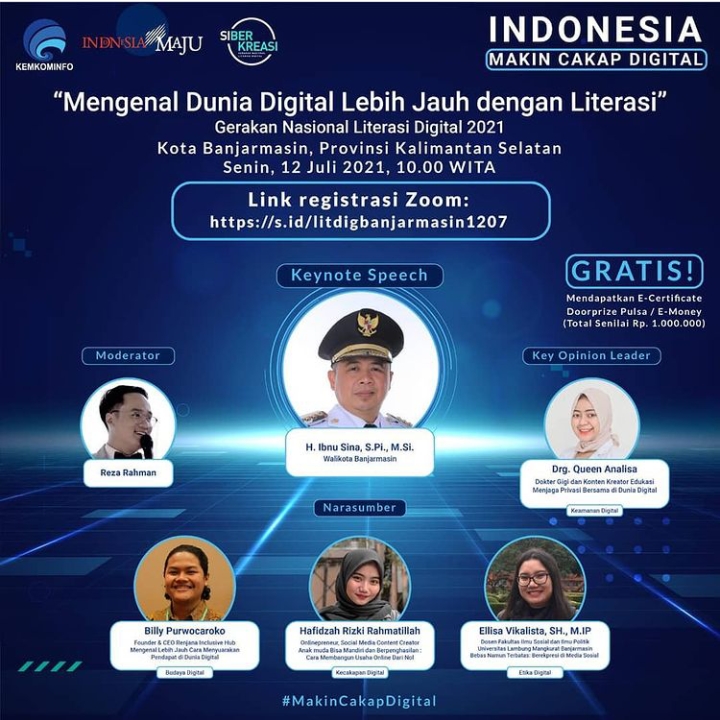 “Mengenal Dunia Digital Lebih Jauh Dengan Literasi” Indonesia Makin Cakap Digital gelaran Kemenkominfo RI bekerjasama dengan Siberkreasi, webinar literasi digital nasional 2021, Kota Banjarmasin, Senin (12/7/2021), moderator Reza Rahman.